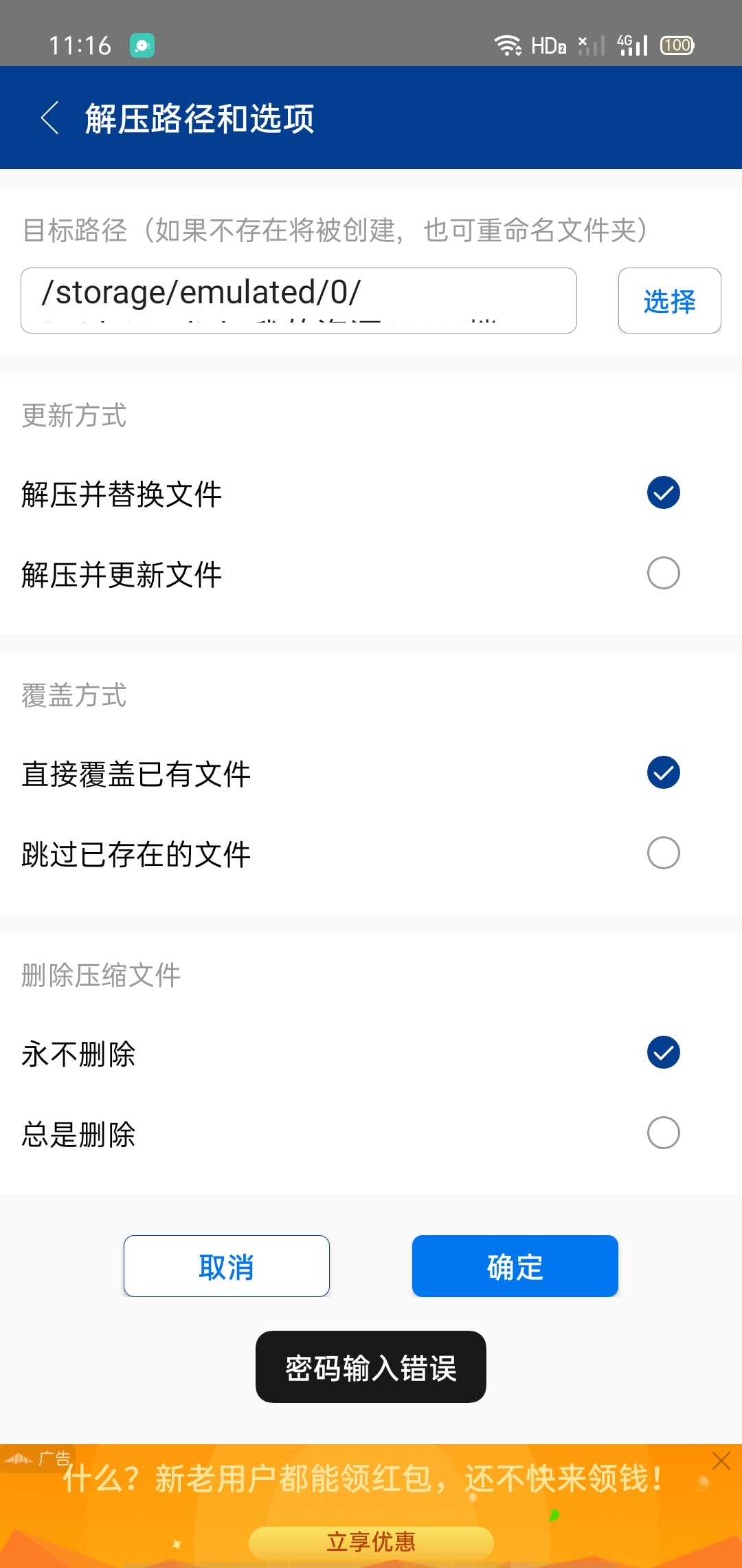 我按照这个步骤解压到60%多显示密码错误什么原因?